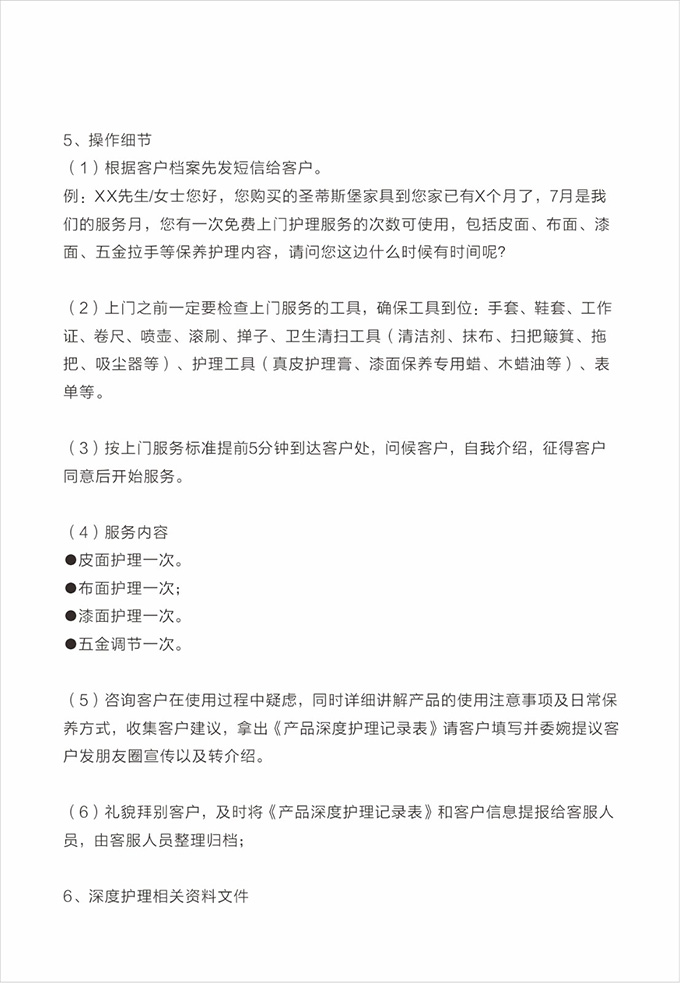 话术参考:“**先生/女士您好,我是圣蒂斯堡的售后服务人员**,您购买的圣蒂斯堡家具已经全部到货了,送货安装大约需要**时间,请问您这边什么时候方便我们上门送货安装呢?”同时要了解送货小区的电梯、楼道、入户门的尺寸等,提前做好准备,避免意外情况。最后确定送货时间(安装所需要时长),并告知客户安装人员的相关信息,可加微信发送,并发送配送安装流程说明。